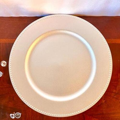 This set of 6 metallic gold plastic charger plates will take your breath away with their unique color and style. Paired with a napkin and a gold or rhinestone napkin ring , they make a wonderful and elegant addition to any table. (Napkin and napkin ring not included)